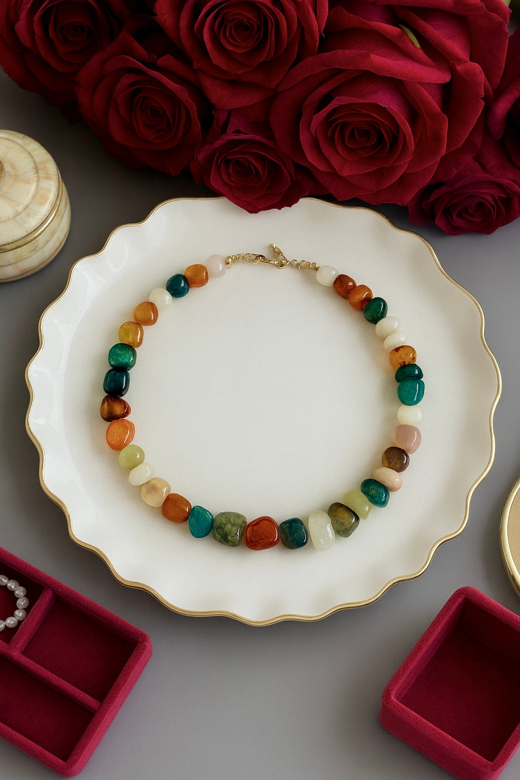 This natural stone necklace blends warm ambers, earthy greens, and soft neutrals in an organic mix of uneven beads, giving it a relaxed yet refined charm. Crafted from a selection of agate, jade, quartz, and other natural stones, it adds a subtle pop of color to any outfit. Its adjustable length makes it easy to style as a close collar or a slightly longer neckline, making it a versatile everyday piece that complements both classic and bohemian looks.