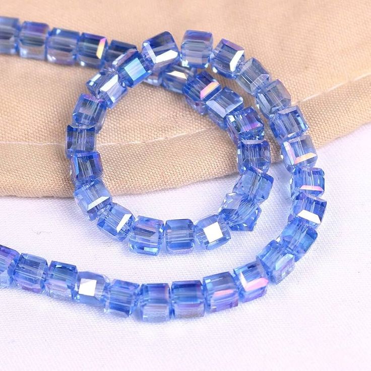 This strand of 8mm faceted cube beads features a stunning sapphire blue tone with a shimmering AB (Aurora Borealis) finish. The reflective surface creates flashes of purple and silver, giving each bead a brilliant sparkle. Crafted from very high-quality glass, these beads are ideal for making elegant bracelets, necklaces, earrings, and DIY crafts.